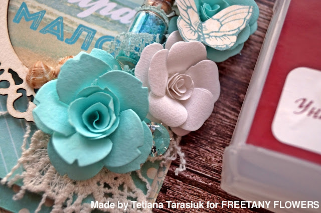 В работе я использовала кружево,чипборд,вырубку,стеклянную баночку с цветным песком,стразы,ракушки,акриловую краску,цветочки Freetany Flowers 9 Аквамарин и 17 Dreams.